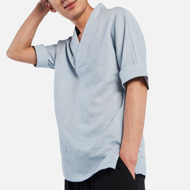 Men's Chinese Style Vintage Cotton Linen T-shirts V-neck Seven-point Sleeve Tops